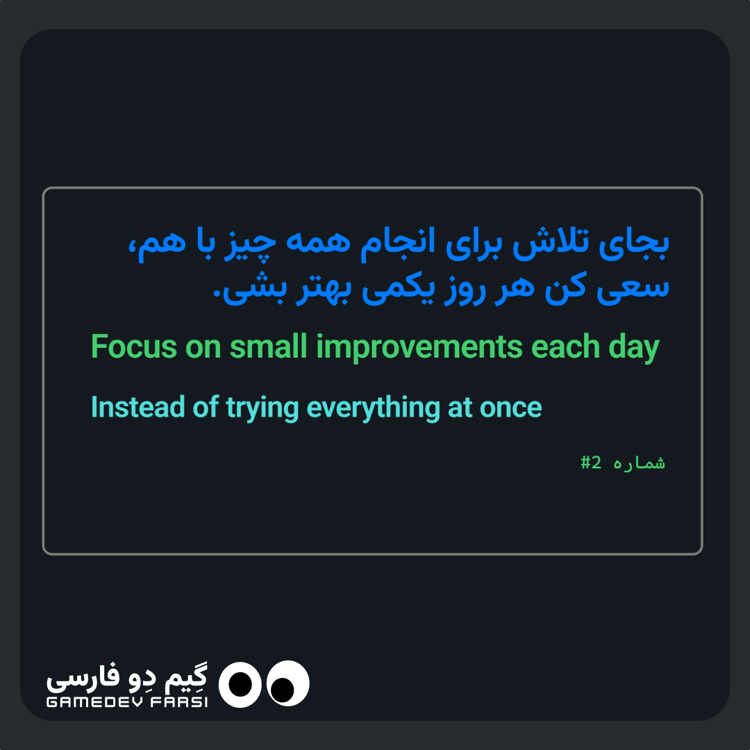 بجای تلاش برای انجام همه چیز با هم، سعی کن هر روز یکمی بهتر بشی. Focus on small improvements each day, Instead of trying everything at once.